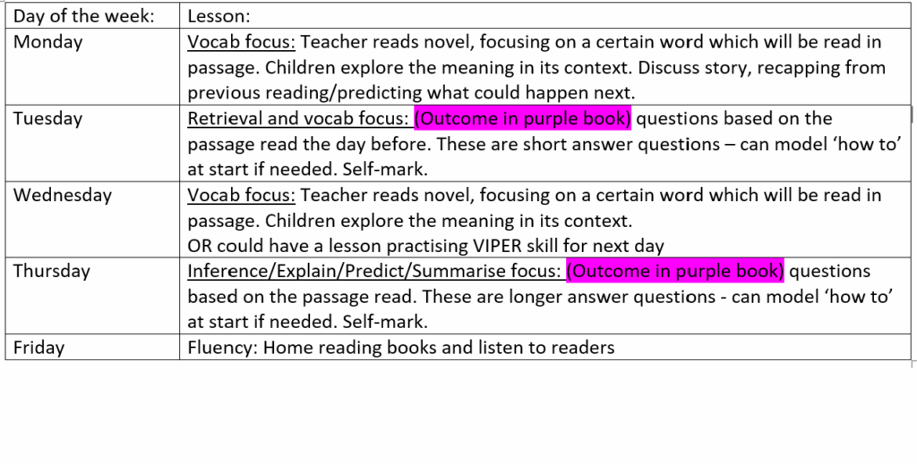 Reading lessons are taught daily across the school. Reading skills are taught under the heading of: Vocabulary, Inference, Predict, Explain, Retrieve and Summarise / Sequence. These are known in school as VIPERS. Our National Curriculum Progression documents map out which objectives and VIPERS are taught in each year group.