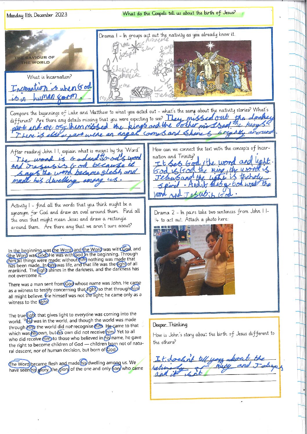 Three times a year, the whole school studies an ‘Understanding Christianity’ unit, which follows the liturgical calendar: Incarnation at Christmas; Salvation at Easter and God & Kingdom of God at Pentecost. These units are special as they are a time when children have the opportunity to learn about the faith that is the foundation of the school; they learn about Christianity and from it, making links to their own lives and the life of the community.